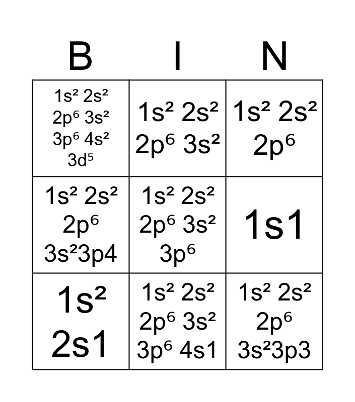 This bingo card has 9 words: 1s² 2s1, 1s² 2s² 2p⁶, 1s² 2s² 2p⁶ 3s², 1s² 2s² 2p⁶ 3s²3p4, 1s² 2s² 2p⁶ 3s² 3p⁶ 4s² 3d⁵, 1s1, 1s² 2s² 2p⁶ 3s² 3p⁶, 1s² 2s² 2p⁶ 3s²3p3 and 1s² 2s² 2p⁶ 3s² 3p⁶ 4s1.