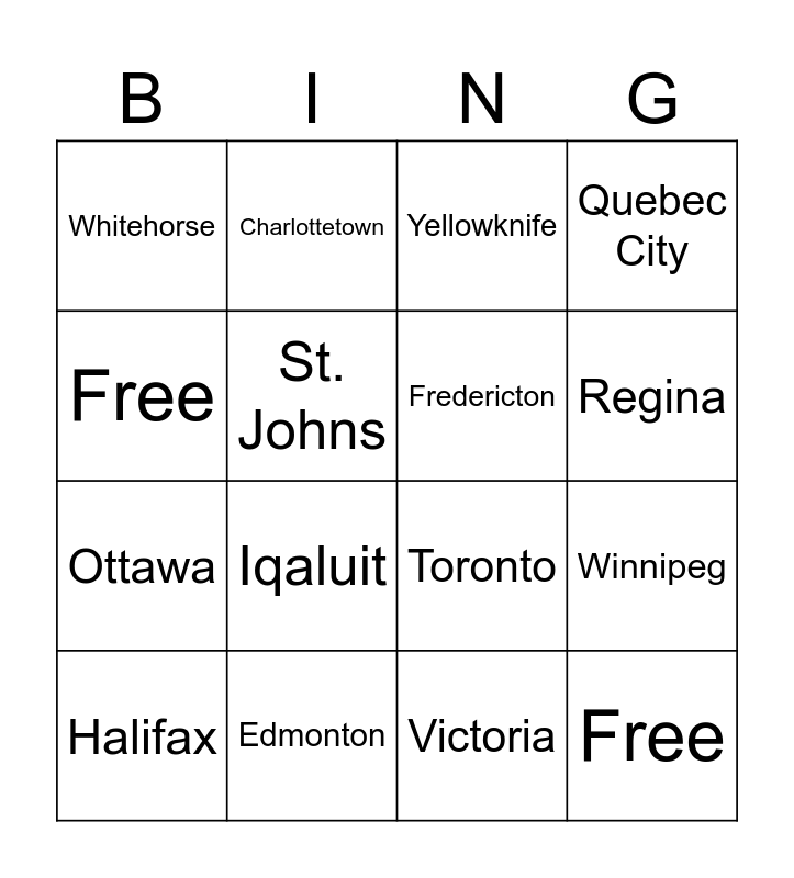This bingo card has 16 words: Edmonton, Winnipeg, Yellowknife, Whitehorse, Ottawa, Charlottetown, Toronto, Victoria, Free, St. Johns, Halifax, Quebec City, Iqaluit, Regina, Fredericton and Free.