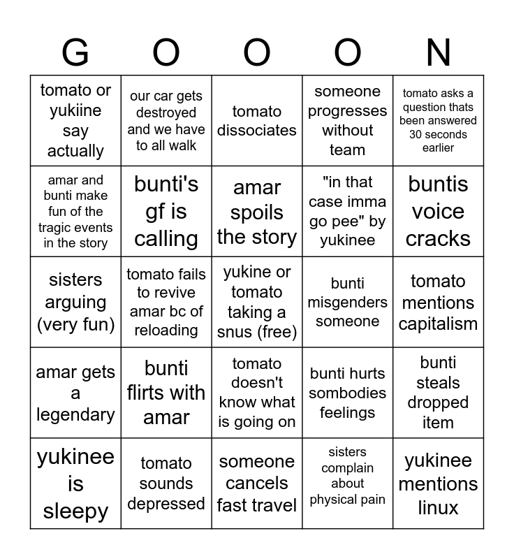 This bingo card has a free space and 39 words: yukinee's having technical issues, tomato is drunk/high, someone turns bri'ish, bunti's gf is calling, yukinee is sleepy, tomato doesn't know what is going on, amar spoils the story, bunti takes credit for all the damage, tomato asks a question thats been answered 30 seconds earlier, amar gets a legendary, tomato fails to revive amar bc of reloading, someone progresses without team, yukinee mentions linux, tomato mentions capitalism, bunti misgenders someone, bunti flirts with amar, yukinee says something unhinged, tomato or yukiine say actually, amar's internet dies, bunti hurts sombodies feelings, amar and bunti make fun of the tragic events in the story, someone cancels fast travel, "in that case imma go pee" by yukinee, buntis voice cracks, yukiine mentions chatgpt, two players die in rapid succesion (around 1 minute), yukiine being confident on a take that ends up being completely wrong, game bugs out, "im gonna gamble", our car gets destroyed and we have to all walk, someone drives a shared car like a lunatic, the gambler gets knocked by the nade, tomato dissociates, tomato sounds depressed, sisters complain about physical pain, someone gets lost in the sanctuary, bunti steals dropped item, sisters arguing (very fun) and someone moans.