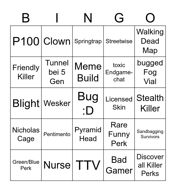 This bingo card has a free space and 24 words: Pentimento, Nurse, Meme Build, Green/Blue Perk, Walking Dead Map, P100, Friendly Killer, Clown, Licensed Skin, Pyramid Head, toxic Endgame-chat, Blight, Rare Funny Perk, Sandbagging Survivors, Tunnel bei 5 Gen, Bad Gamer, Stealth Killer, Springtrap, bugged Fog Vial, Wesker, Discover all Killer Perks, Nicholas Cage, Streetwise and TTV.