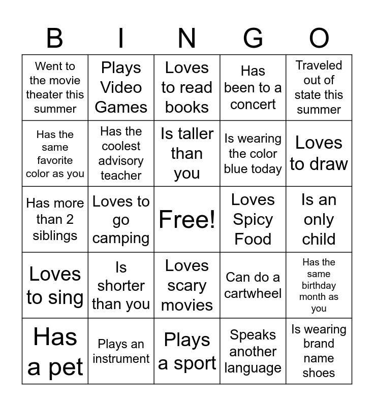 This bingo card has a free space and 24 words: Has a pet, Is shorter than you, Is taller than you, Speaks another language, Traveled out of state this summer, Went to the movie theater this summer, Plays Video Games, Loves to read books, Loves Spicy Food, Is an only child, Has more than 2 siblings, Has the coolest advisory teacher, Can do a cartwheel, Has the same birthday month as you, Has the same favorite color as you, Plays an instrument, Plays a sport, Has been to a concert, Loves to draw, Loves to sing, Loves to go camping, Loves scary movies, Is wearing the color blue today and Is wearing brand name shoes.