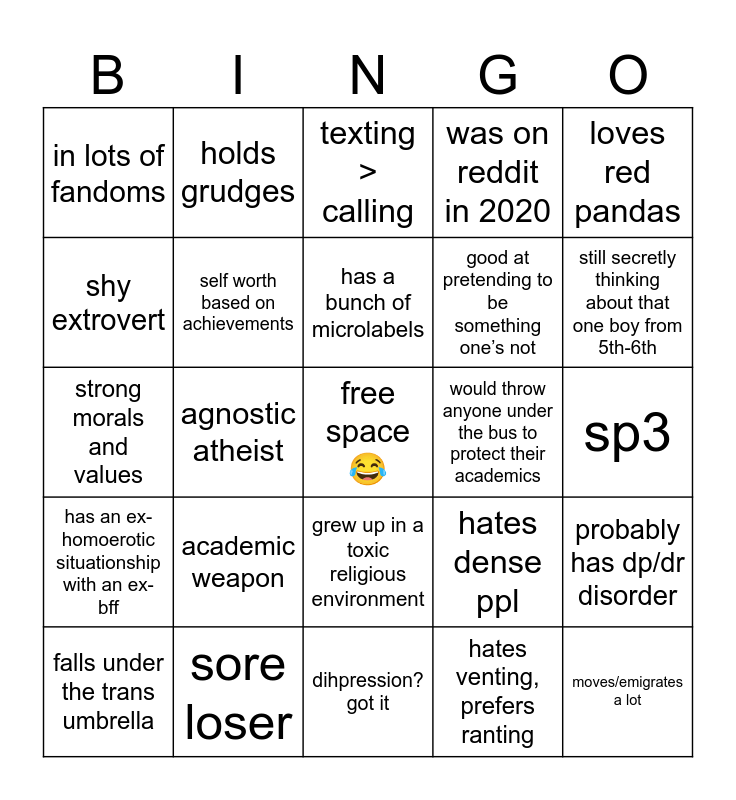 This bingo card has a free space and 24 words: academic weapon, sore loser, has a bunch of microlabels, falls under the trans umbrella, loves red pandas, in lots of fandoms, shy extrovert, holds grudges, would throw anyone under the bus to protect their academics, grew up in a toxic religious environment, good at pretending to be something one’s not, strong morals and values, hates dense ppl, probably has dp/dr disorder, self worth based on achievements, hates venting, prefers ranting, sp3, texting > calling, still secretly thinking about that one boy from 5th-6th, agnostic atheist, moves/emigrates a lot, has an ex-homoerotic situationship with an ex-bff, was on reddit in 2020 and dihpression? got it.