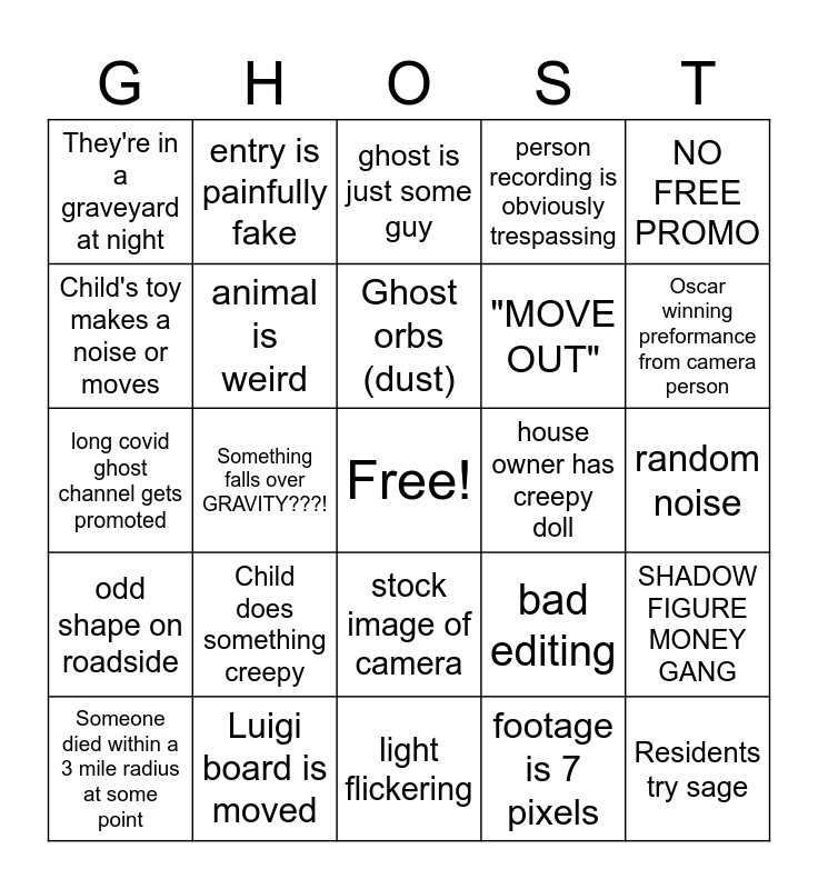 This bingo card has a free space and 24 words: Child does something creepy, Luigi board is moved, Ghost orbs (dust), Someone died within a 3 mile radius at some point, NO FREE PROMO, They're in a graveyard at night, Child's toy makes a noise or moves, entry is painfully fake, house owner has creepy doll, stock image of camera, "MOVE OUT", long covid ghost channel gets promoted, bad editing, SHADOW FIGURE MONEY GANG, animal is weird, footage is 7 pixels, random noise, ghost is just some guy, Oscar winning preformance from camera person, Something falls over GRAVITY???!, Residents try sage, odd shape on roadside, person recording is obviously trespassing and light flickering.