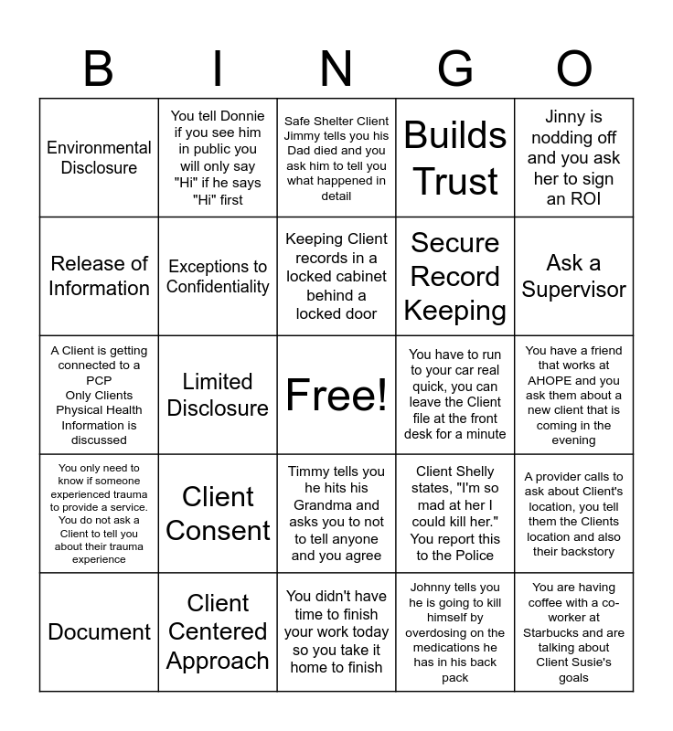 This bingo card has a free space and 24 words: Client Consent, Client Centered Approach, Keeping Client records in a locked cabinet behind a locked door, Document, Jinny is nodding off and you ask her to sign an ROI, Environmental Disclosure, Release of Information, You tell Donnie if you see him in public you will only say "Hi" if he says "Hi" first, You have to run to your car real quick, you can leave the Client file at the front desk for a minute, Timmy tells you he hits his Grandma and asks you to not to tell anyone and you agree, Secure Record Keeping, A Client is getting connected to a PCP Only Clients Physical Health Information is discussed, Client Shelly states, "I'm so mad at her I could kill her." You report this to the Police, A provider calls to ask about Client's location, you tell them the Clients location and also their backstory, Exceptions to Confidentiality, Johnny tells you he is going to kill himself by overdosing on the medications he has in his back pack, You have a friend that works at AHOPE and you ask them about a new client that is coming in the evening, Safe Shelter Client Jimmy tells you his Dad died and you ask him to tell you what happened in detail, Ask a Supervisor, Limited Disclosure, You are having coffee with a co-worker at Starbucks and are talking about Client Susie's goals, You only need to know if someone experienced trauma to provide a service. You do not ask a Client to tell you about their trauma experience, Builds Trust and You didn't have time to finish your work today so you take it home to finish.