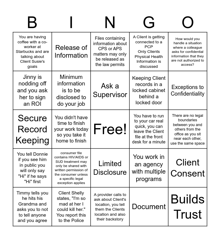 This bingo card has a free space and 28 words: Client Consent, Client Centered Approach, Keeping Client records in a locked cabinet behind a locked door, Document, Jinny is nodding off and you ask her to sign an ROI, Files containing information about CPS or APS matters may only be released as the law permits, Release of Information, You tell Donnie if you see him in public you will only say "Hi" if he says "Hi" first, You have to run to your car real quick, you can leave the Client file at the front desk for a minute, Timmy tells you he hits his Grandma and asks you to not to tell anyone and you agree, Secure Record Keeping, A Client is getting connected to a PCP Only Clients Physical Health Information is discussed, Client Shelly states, "I'm so mad at her I could kill her." You report this to the Police, A provider calls to ask about Client's location, you tell them the Clients location and also their backstory, Exceptions to Confidentiality, Johnny tells you he is going to kill himself by overdosing on the medications he has in his back pack, consumer file contains HIV/AIDS or SUD treatment may only be shared with written permission of the consumer unless a specific legal exception applies, Minimum information is to be disclosed to do your job, Ask a Supervisor, Limited Disclosure, You are having coffee with a co-worker at Starbucks and are talking about Client Susie's goals, Your worksite is where you work, you can have client documentation in your work space for access if needed., Builds Trust, You didn't have time to finish your work today so you take it home to finish, There are no legal boundaries between you and others from the office as you sit near each other, use the same space, You work in an agency with multiple programs, How would you handle a situation where a colleague asks for confidential information that they are not authorized to access? and What steps would you take if you accidentally sent confidential information to the wrong person?.