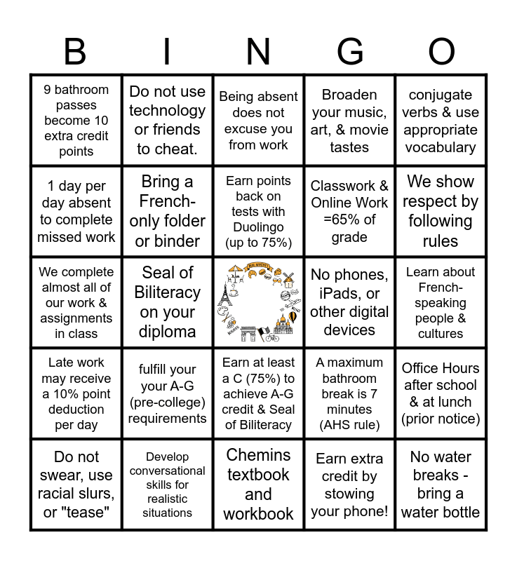 This bingo card has a free space and 24 words: fulfill your your A-G (pre-college) requirements, Develop conversational skills for realistic situations, Earn points back on tests with Duolingo (up to 75%), Do not swear, use racial slurs, or "tease", conjugate verbs & use appropriate vocabulary, 9 bathroom passes become 10 extra credit points, 1 day per day absent to complete missed work, Do not use technology or friends to cheat., No phones, iPads, or other digital devices, Earn at least a C (75%) to achieve A-G credit & Seal of Biliteracy, Classwork & Online Work =65% of grade, We complete almost all of our work & assignments in class, A maximum bathroom break is 7 minutes (AHS rule), Office Hours after school & at lunch (prior notice), Bring a French-only folder or binder, Earn extra credit by stowing your phone!, Learn about French-speaking people & cultures, Being absent does not excuse you from work, We show respect by following rules, Seal of Biliteracy on your diploma, No water breaks - bring a water bottle, Late work may receive a 10% point deduction per day, Broaden your music, art, & movie tastes and Chemins textbook and workbook.