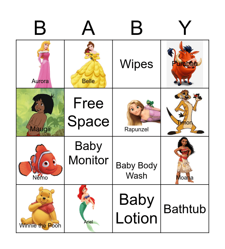 This bingo card has 28 images and 46 words: Mickey Mouse, Winnie the Pooh, Olaf, Elsa, Minnie Mouse, Belle, Anna, Free Space, Simba, Rapunzel, Pumbaa, Jasmine, Snow White, Aladdin, Pinocchio, Timon, Ariel, Genie, Maugli, Moana, Cinderella, Aurora, Nemo, Bambi, Baby Monitor, Mike, Joy, Bathtub, Diaper Pail, Baby Shampoo, Teething Ring, Play mat, Changing Pad, Washcloths, 🪇 Rattles, Baby Lotion, Burp Cloths, Changing Table, Bottle Drying Rack, 🧦 Socks, Wipes, Baby Pajamas, Baby Body Wash, Thermometer, Bouncer and Baby Hat.