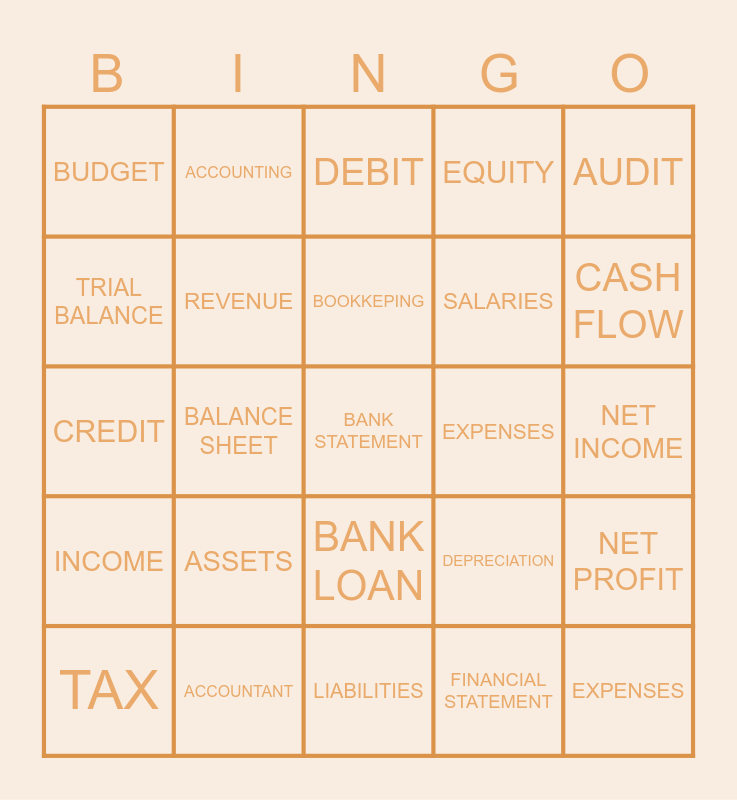 This bingo card has a free space and 24 words: ASSETS, ACCOUNTANT, BOOKKEPING, TAX, AUDIT, BUDGET, TRIAL BALANCE, ACCOUNTING, EXPENSES, BANK LOAN, SALARIES, CREDIT, DEPRECIATION, NET PROFIT, REVENUE, FINANCIAL STATEMENT, NET INCOME, DEBIT, CASH FLOW, BALANCE SHEET, EXPENSES, INCOME, EQUITY and LIABILITIES.