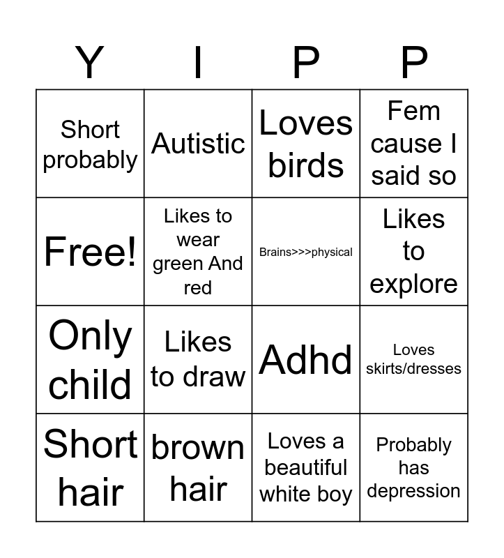 This bingo card has 16 words: brown hair, Loves skirts/dresses, Loves birds, Short probably, Only child, Autistic, Adhd, Loves a beautiful white boy, Free!, Likes to wear green And red, Short hair, Fem cause I said so, Likes to draw, Likes to explore, Brains>>>physical and Probably has depression.