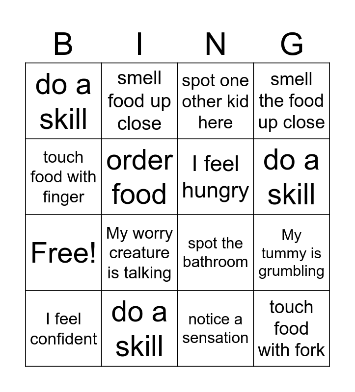 This bingo card has 19 words: spot the bathroom, figure out server's name, spot one other kid here, touch food with fork, My tummy is grumbling, touch food with finger, notice a sensation, do a skill, smell food up close, Free!, My worry creature is talking, order food, I feel hungry, do a skill, I feel confident, sit at table, smell the food up close, do a skill and stay at table whole time.