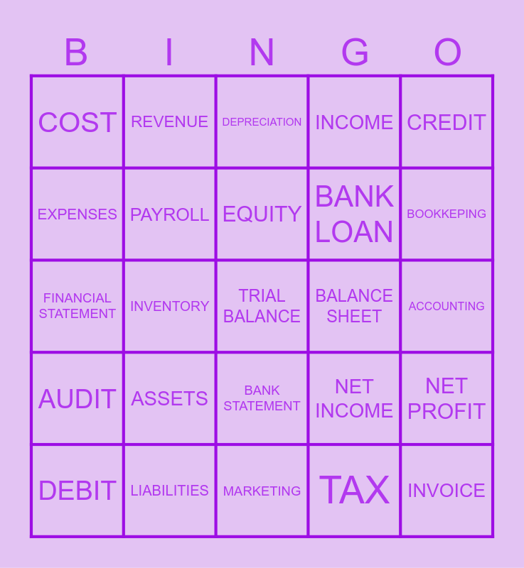 This bingo card has a free space and 24 words: ASSETS, LIABILITIES, EQUITY, DEBIT, CREDIT, COST, EXPENSES, REVENUE, BALANCE SHEET, BANK STATEMENT, BANK LOAN, FINANCIAL STATEMENT, NET INCOME, NET PROFIT, PAYROLL, TAX, ACCOUNTING, DEPRECIATION, BOOKKEPING, INVENTORY, INVOICE, AUDIT, INCOME and MARKETING.
