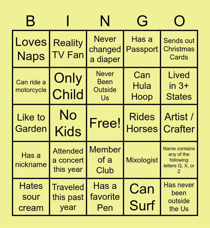 This bingo card has a free space and 74 words: Named after a relative, Grandparent, Never changed a diaper, Has a pass port, Has a pair of crocs, Under 5' Tall, 4+ Siblings, Never been out of US, Hates sour cream, Owns 20+ Pairs of shoes, Vegetarian, Parent, Never Been Outside Us, Can ride a motorcycle, Can drive a stick shift, No Kids, True Crime Fan, Lived in 3+ States, Horror Movie Fan, Like to Garden, Only Child, Reality TV Fan, Has a Passport, Sci-Fi Movie Fan, Has never been outside the Us, Hallmark Channel Fan, Comedy Fan, Likes Pineapple on Pizza, College Football Fan, Met a Celebrity, Sends out Christmas Cards, Born on a Holiday or Feb 29, Uses a paper planner Calendar, Has a side Hustle, Member of a band, Can Surf, Can Scuba Dive, Pod Cast Fan, Has a Tattoo, Wears Contacts, Has a favorite Pen, Traveled this past year, Plays an instrument, Loves Karaoke, Does Yoga, Loves Naps, Hates Coffee, Attended a concert this year, Traveled this year, Has a phobia, Decorates Home for Holidays, Rode in a Hot Air Balloon, Artist / Crafter, Never learned to ride a bike, Owns more than 1 vehicle, Has a food Allergy, Member of a Club, Hides snacks from family, Won more than $500 at a casino, Name contains any of the following letters Q, X, or Z, Can Hula Hoop, Can Juggle, Has a nickname, Has Ran a Marathon or 5K, Rides Horses, Loves Sweet Tea, Doesn't like Cake, Gamer, Mixologist, Can Crochet or Knit, Loves to Read Books, Trades Bit Coin, Member of a band or singing group and Acted in a play.