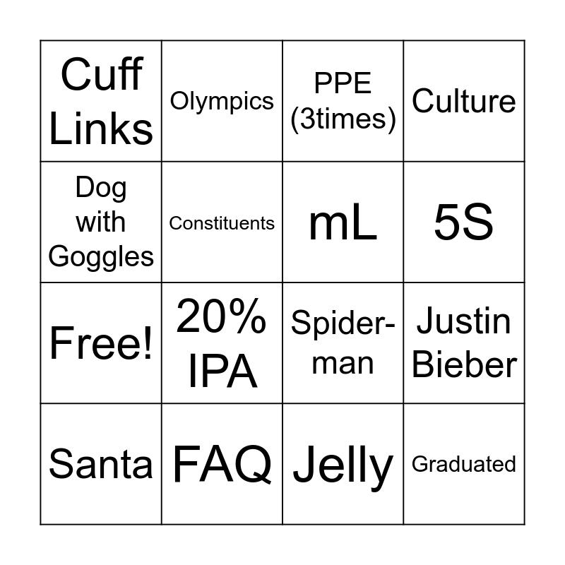 This bingo card has 20 words: Justin Bieber, Porcupine, PPE (3times), Snail, Santa, Dog with Goggles, FAQ, Cuff Links, Free!, Olympics, 20% IPA, Spider-man, Constituents, Graduated, mL, Vacuum, 5S, Culture, Jelly and GHS.