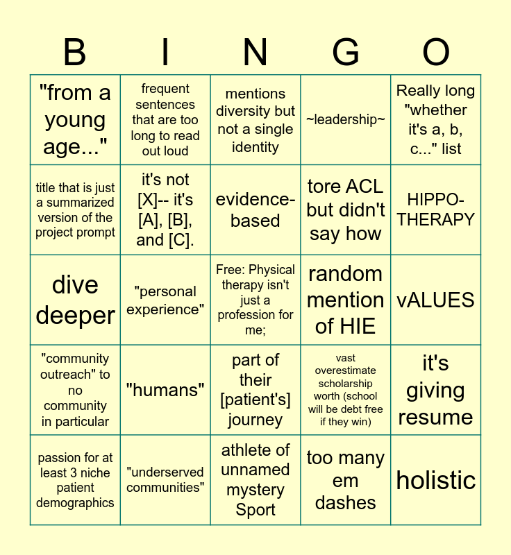 This bingo card has a free space and 24 words: "humans", "underserved communities", evidence-based, passion for at least 3 niche patient demographics, Really long "whether it's a, b, c..." list, "from a young age...", title that is just a summarized version of the project prompt, frequent sentences that are too long to read out loud, random mention of HIE, part of their [patient's] journey, tore ACL but didn't say how, dive deeper, vast overestimate scholarship worth (school will be debt free if they win), it's giving resume, it's not [X]-- it's [A], [B], and [C]., too many em dashes, vALUES, mentions diversity but not a single identity, HIPPO-THERAPY, "personal experience", holistic, "community outreach" to no community in particular, ~leadership~ and athlete of unnamed mystery Sport.