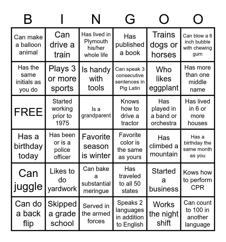 This bingo card has 36 words: Has traveled to all 50 states, Can bake a substantial meringue, Speaks 2 languages in addition to English, Has the same initials as you do, Has a birthday today, Knows how to drive a tractor, Plays 3 or more sports, Served in the armed forces, Trains dogs or horses, Started a business, Has more than one middle name, Has published a book, Kows how to perform CPR, Started working prior to 1975, Can speak 3 consecutive sentences in Pig Latin, Can make a balloon animal, Can juggle, Has played in a band or orchestra, FREE, Has lived in Plymouth his/her whole life, Is a grandparent, Has been or is a police officer, Favorite color is the same as yours, Favorite season is winter, Has climbed a mountain, Can drive a train, Who likes eggplant, Skipped a grade school, Is handy with tools, Can blow a 6 inch bubble with chewing gum, Can count to 100 in another language, Can do a back flip, Has a birthday the same month as you, Has lived in 6 or more houses, Likes to do yardwork and Works the night shift.