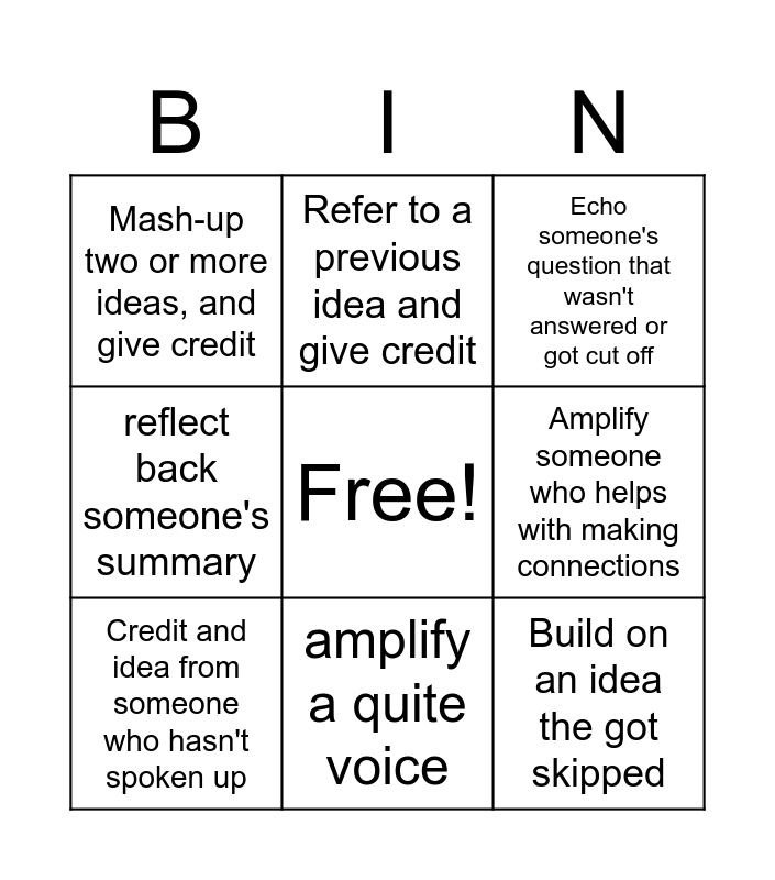 This bingo card has a free space and 10 words: amplify a quite voice, Echo someone's question that wasn't answered or got cut off, Mash-up two or more ideas, and give credit, Build on an idea the got skipped, reflect back someone's summary, Credit and idea from someone who hasn't spoken up, Refer to a previous idea and give credit, Thank someone for helping you connect, Amplify someone who helps with making connections and Restate an idea and add to it..