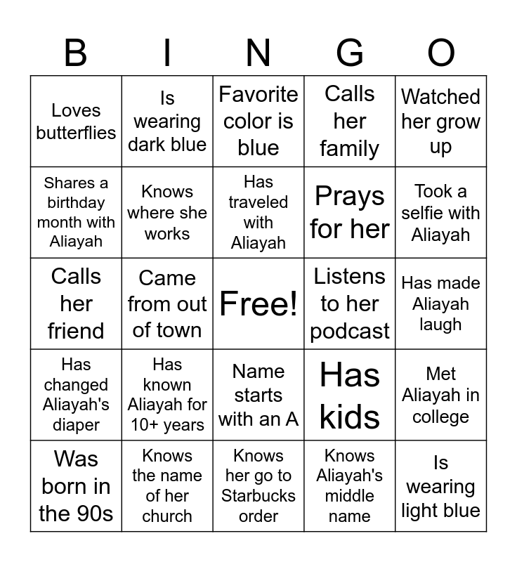 This bingo card has a free space and 24 words: Has known Aliayah for 10+ years, Knows the name of her church, Has traveled with Aliayah, Was born in the 90s, Watched her grow up, Loves butterflies, Shares a birthday month with Aliayah, Is wearing dark blue, Listens to her podcast, Name starts with an A, Prays for her, Calls her friend, Has kids, Met Aliayah in college, Knows where she works, Knows Aliayah's middle name, Has made Aliayah laugh, Favorite color is blue, Took a selfie with Aliayah, Came from out of town, Is wearing light blue, Has changed Aliayah's diaper, Calls her family and Knows her go to Starbucks order.