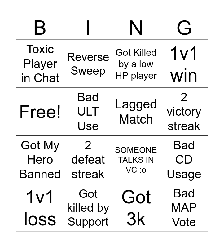 This bingo card has 16 words: Got killed by Support, Bad CD Usage, Got Killed by a low HP player, Toxic Player in Chat, Got My Hero Banned, Reverse Sweep, SOMEONE TALKS IN VC :o, Got 3k, Free!, Bad ULT Use, 1v1 loss, 1v1 win, 2 defeat streak, 2 victory streak, Lagged Match and Bad MAP Vote.