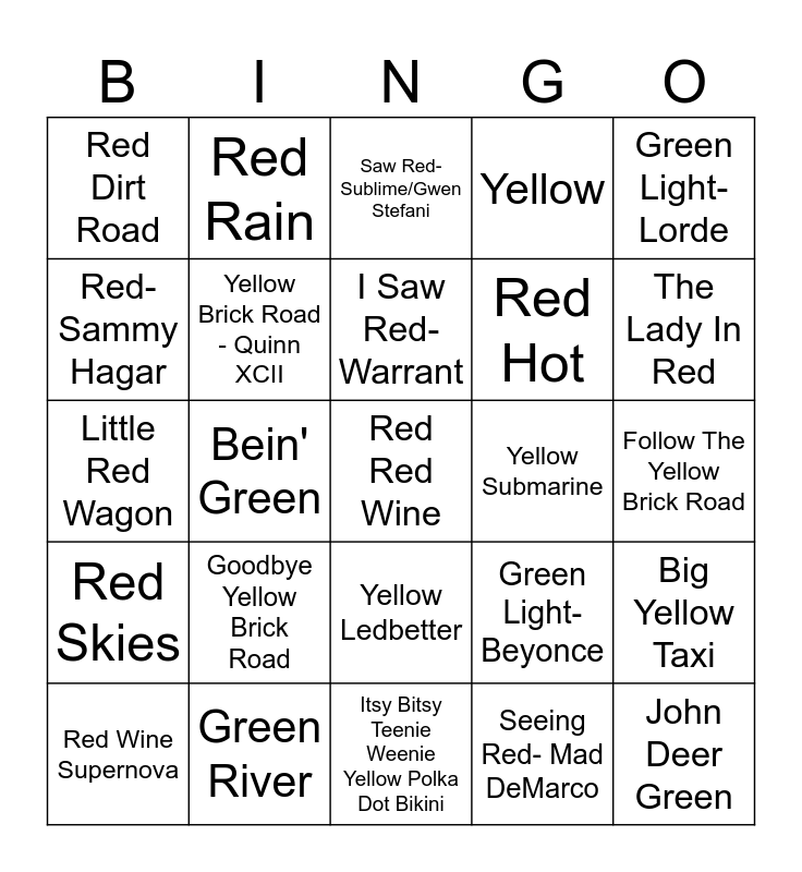 This bingo card has 45 words: Red- Taylor Swift, Red Red Wine, Red Solo Cup, Red Wine Supernova, The Red- Chevelle, Seeing Red- Mad DeMarco, Saw Red- Sublime/Gwen Stefani, Green Onions, Green Light- Lorde, Green River, Yellow, Yellow Submarine, Yellow Ledbetter, Goodbye Yellow Brick Road, Mellow Yellow, Itsy Bitsy Teenie Weenie Yellow Polka Dot Bikini, Little Red Corvette, Little Red Wagon, Lil' Red Riding Hood, The Lady In Red, Red Rain, Little Red Rooster, 99 Red Balloons, Red Dirt Road, Bodak Yellow, Follow The Yellow Brick Road, Yellow Flicker Beat, Green Light- John Legend, Green Light- Beyonce, Red Skies, Redbone, Big Yellow Taxi, Green-Eyed Lady, Green Tamborine, Crimson & Clover, Bein' Green, Green Acres, Bitter Green, John Deer Green, I Saw Red- Warrant, Red- Sammy Hagar, Red Hot, Red Kingdom, Yellow Brick Road - Quinn XCII and Red Light Special.