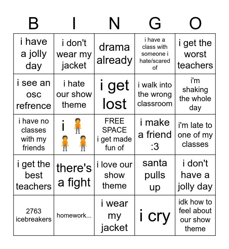 This bingo card has a free space and 24 words: there's a fight, homework..., i get lost, 2763 icebreakers, i get the worst teachers, i have a jolly day, i see an osc refrence, i don't wear my jacket, i make a friend :3, i love our show theme, i walk into the wrong classroom, i have no classes with my friends, santa pulls up, i don't have a jolly day, i hate our show theme, i cry, i'm late to one of my classes, drama already, i'm shaking the whole day, i 🧍🧍🧍, idk how to feel about our show theme, i get the best teachers, i have a class with someone i hate/scared of and i wear my jacket.