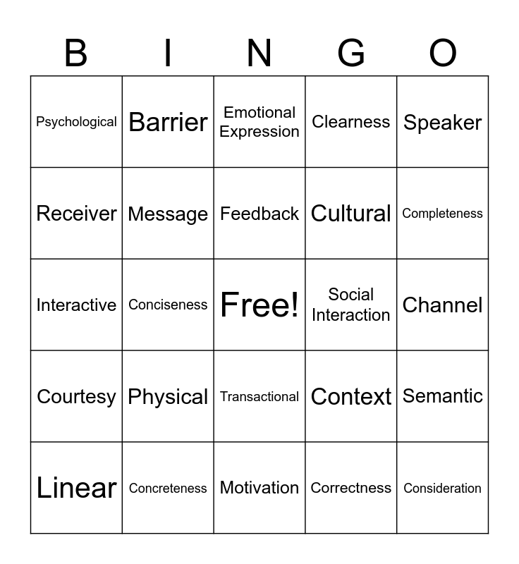 This bingo card has a free space and 25 words: Physical, Motivation, Feedback, Linear, Speaker, Psychological, Receiver, Barrier, Social Interaction, Transactional, Cultural, Interactive, Context, Semantic, Message, Information Dissemination, Channel, Emotional Expression, Completeness, Conciseness, Consideration, Concreteness, Courtesy, Clearness and Correctness.