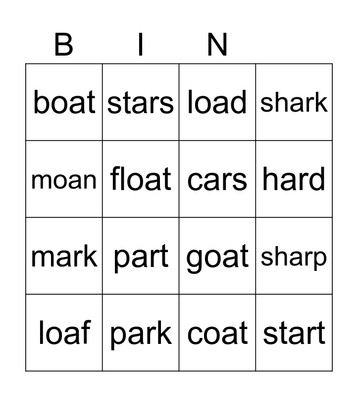 This bingo card has 16 words: park, sharp, load, boat, mark, stars, goat, coat, moan, float, loaf, shark, part, hard, cars and start.