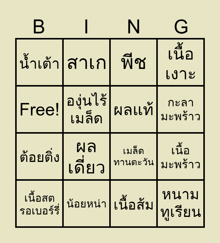 This bingo card has 16 words: น้อยหน่า, เนื้อมะพร้าว, พีช, น้ำเต้า, ต้อยติ่ง, สาเก, เมล็ดทานตะวัน, เนื้อส้ม, Free!, องุ่นไร้เมล็ด, เนื้อสตรอเบอร์รี่, เนื้อเงาะ, ผลเดี่ยว, กะลามะพร้าว, ผลแท้ and หนามทูเรียน.