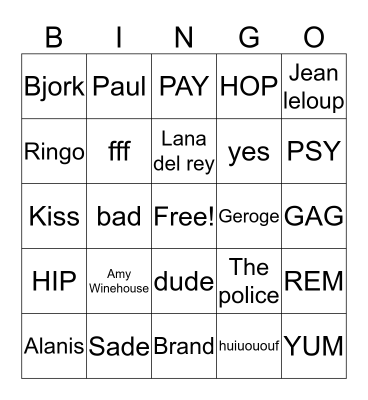 This bingo card has a free space and 24 words: Amy Winehouse, Sade, Lana del rey, Alanis, Jean leloup, Bjork, Ringo, Paul, Geroge, dude, yes, Kiss, The police, REM, fff, huiuououf, GAG, PAY, PSY, bad, YUM, HIP, HOP and Brand.