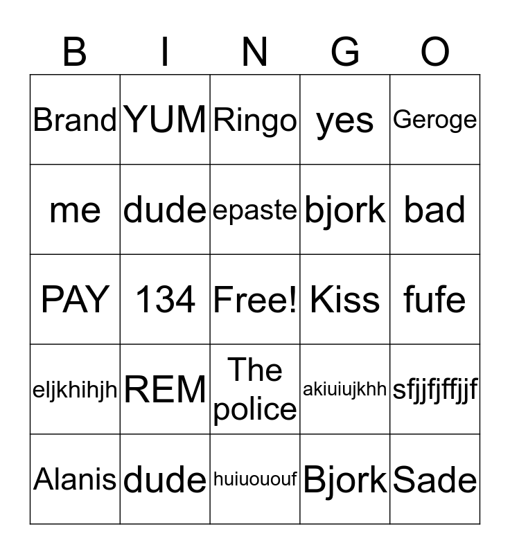 This bingo card has a free space and 44 words: Amy Winehouse, Sade, Lana del rey, Alanis, Jean leloup, Bjork, Ringo, Paul, Geroge, dude, yes, Kiss, The police, REM, fff, huiuououf, GAG, PAY, PSY, bad, YUM, HIP, HOP, Brand, yes, fufe, dhdshshs, jjuejeheh, akiuiujkhh, eljkhihjh, ekjaiakhfah, sfjjfjffjjf, 1, 12, 134, 15677, jehhel, jhello, epaste, me, bjork, yes, dude and laanana.