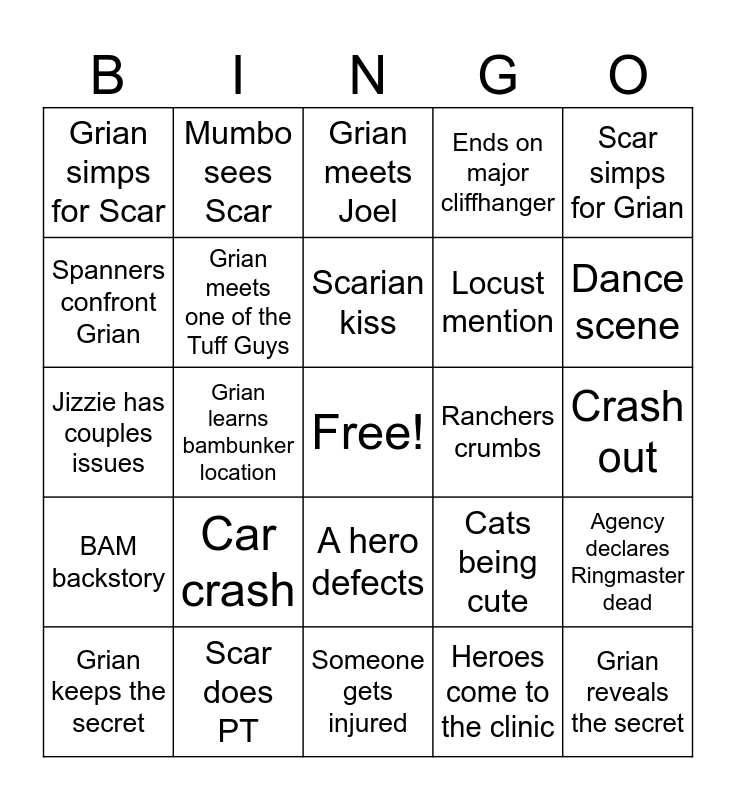 This bingo card has a free space and 24 words: Car crash, Scar does PT, Scarian kiss, Grian keeps the secret, Scar simps for Grian, Grian simps for Scar, Spanners confront Grian, Mumbo sees Scar, Ranchers crumbs, A hero defects, Locust mention, Jizzie has couples issues, Cats being cute, Agency declares Ringmaster dead, Grian meets one of the Tuff Guys, Heroes come to the clinic, Crash out, Grian meets Joel, Dance scene, Grian learns bambunker location, Grian reveals the secret, BAM backstory, Ends on major cliffhanger and Someone gets injured.