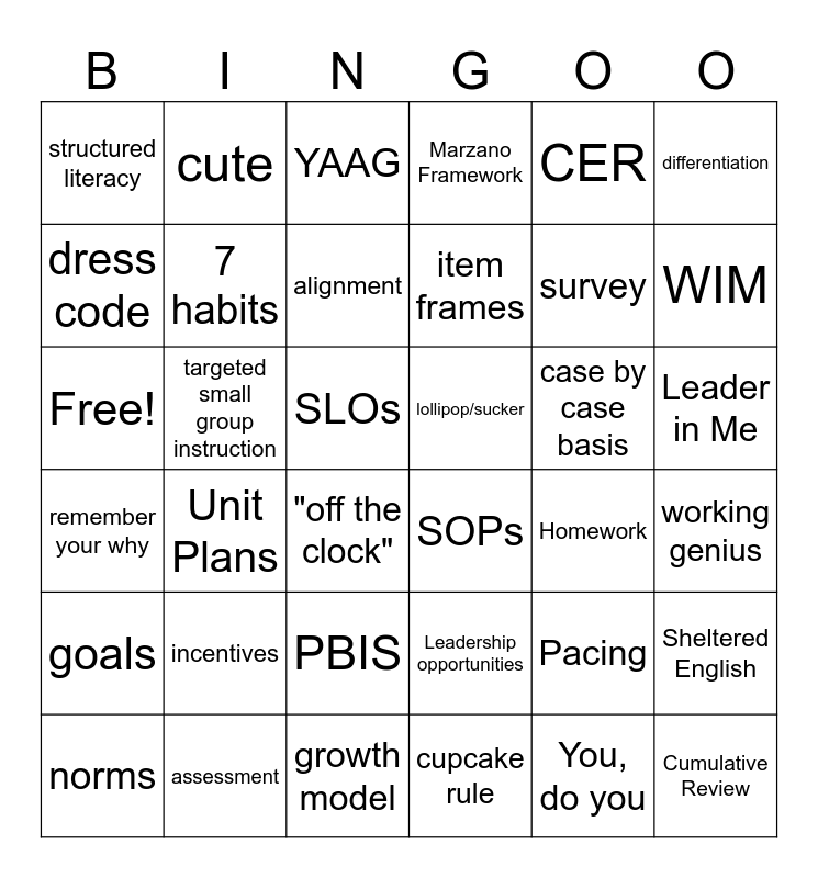 This bingo card has 36 words: Leadership opportunities, PBIS, cupcake rule, dress code, remember your why, lollipop/sucker, 7 habits, growth model, CER, Pacing, WIM, Marzano Framework, Sheltered English, targeted small group instruction, item frames, structured literacy, goals, case by case basis, Free!, YAAG, SLOs, Unit Plans, SOPs, "off the clock", Homework, cute, survey, assessment, alignment, differentiation, Cumulative Review, norms, working genius, Leader in Me, incentives and You, do you.