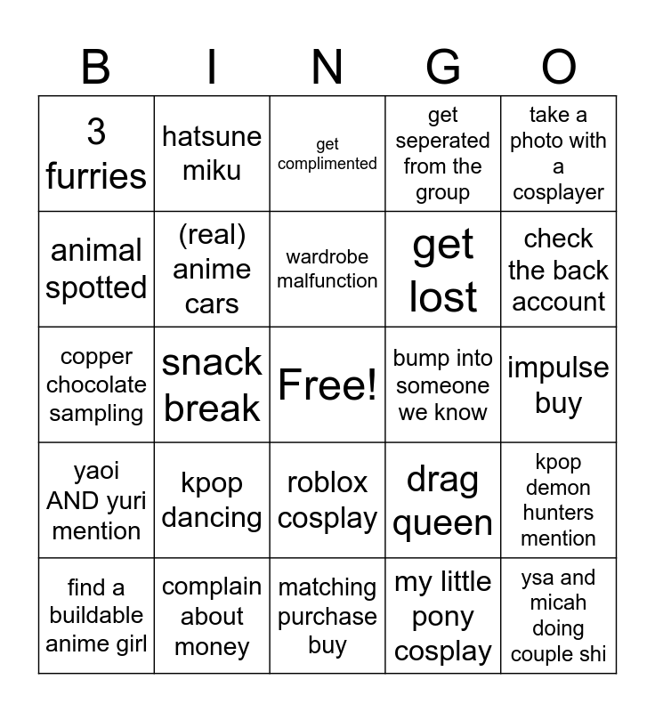 This bingo card has a free space and 33 words: kamen rider build mention, yugioh arc-v mention, snack break, anime body pillow, yaoi AND yuri mention, (real) anime cars, take a photo with a cosplayer, find a buildable anime girl, hatsune miku, teto, wardrobe malfunction, get complimented, summer hikaru died, bathroom break!, bump into someone we know, check the back account, complain about money, copper chocolate sampling, kpop dancing, drag queen, roblox cosplay, fullsuit furry, 3 furries, impulse buy, matching purchase buy, ysa and micah doing couple shi, get seperated from the group, get lost, animal spotted, kpop demon hunters mention, dandadan couple cosplay, my little pony cosplay and irl discord mod spotting.