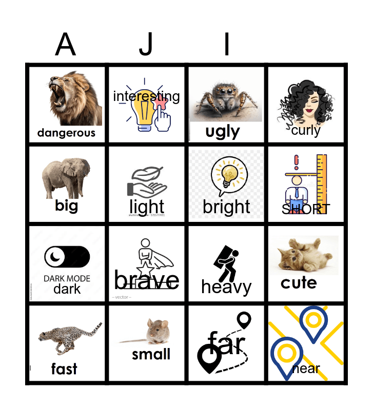 This bingo card has 20 images and 12 words: dark, interesting, brave, heavy, light, near, bright, noisy, SHORT, curly, far and KIND.