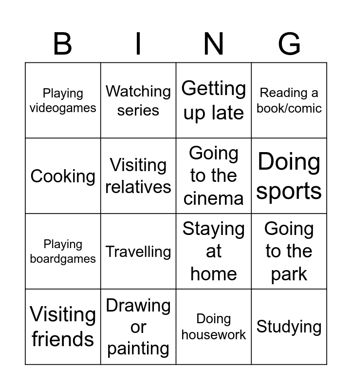 This bingo card has 16 words: Visiting friends, Drawing or painting, Getting up late, Reading a book/comic, Cooking, Watching series, Staying at home, Going to the park, Playing videogames, Visiting relatives, Doing housework, Doing sports, Playing boardgames, Travelling, Going to the cinema and Studying.