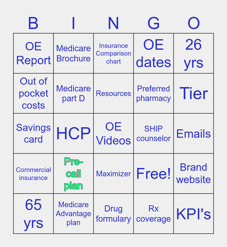 This bingo card has 25 words: Pre-call plan, Drug formulary, Resources, 65 yrs, 26 yrs, OE Report, Out of pocket costs, Medicare Brochure, SHIP counselor, Maximizer, Preferred pharmacy, Savings card, Free!, Brand website, Medicare part D, KPI's, Emails, Insurance Comparison chart, Tier, HCP, OE Videos, Medicare Advantage plan, Commercial insurance, OE dates and Rx coverage.