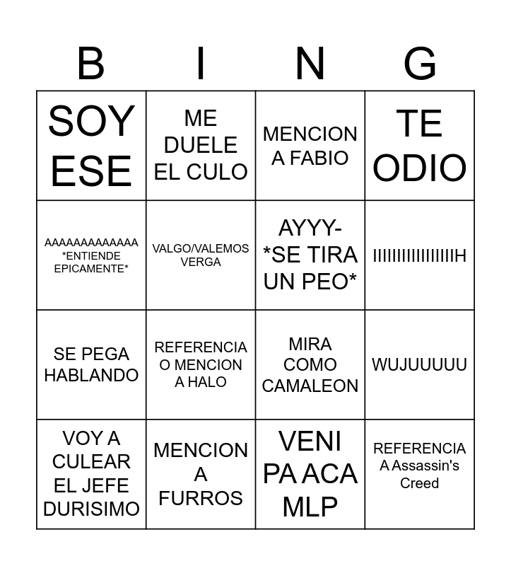 This bingo card has 28 words: REFERECIA A TOKYO GHOUL, REFERENCIA A GOD OF WAR, SE PEGA HABLANDO, MENCION A JACKY, VALGO/VALEMOS VERGA, MENCION A FABIO, ME DUELE EL CULO, REFERENCIA A Assassin's Creed, MENCION A FURROS, CHISTE HOMOSEXUAL, MIRA COMO CAMALEON, TE ODIO, AUKCHIKMI, SE HUELE LOS HUEVOS, REFERENCIA O MENCION A HALO, PERRO HP, ME CAGO EN LA PUTA, AYYY- *SE TIRA UN PEO*, IIIIIIIIIIIIIIIIIH, MUEJEJEJE, SOY ESE, POR QUEEEEEEE?, VOY A CULEAR EL JEFE DURISIMO, WUJUUUUU, VENI PA ACA MLP, QUE CHIMABADA AMOR, AAAAAAAAAAAAA *ENTIENDE EPICAMENTE* and AWKWARD CAT MEME.
