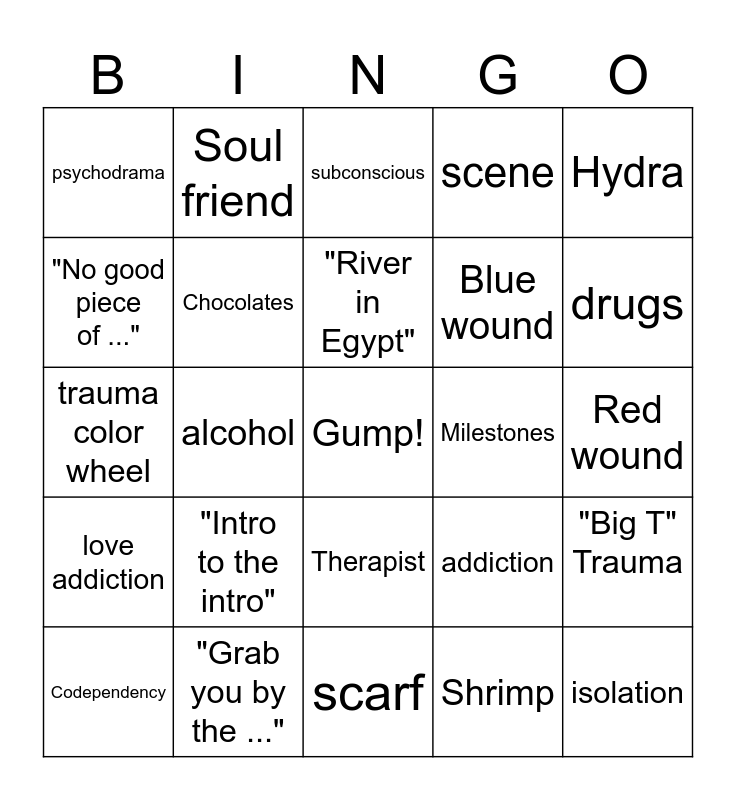 This bingo card has a free space and 24 words: "Intro to the intro", "Grab you by the ...", "River in Egypt", Codependency, Hydra, psychodrama, "No good piece of ...", Soul friend, Milestones, Therapist, Blue wound, trauma color wheel, addiction, "Big T" Trauma, Chocolates, Shrimp, Red wound, subconscious, drugs, alcohol, isolation, love addiction, scene and scarf.