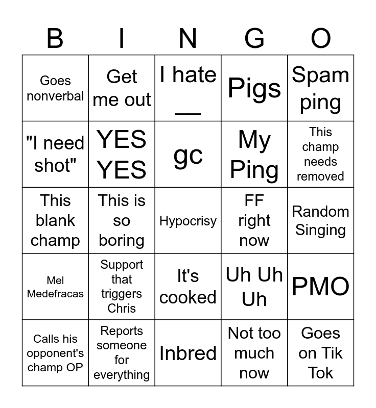 This bingo card has a free space and 24 words: Support that triggers Chris, Reports someone for everything, gc, Calls his opponent's champ OP, Spam ping, Goes nonverbal, "I need shot", Get me out, FF right now, It's cooked, My Ping, This blank champ, Uh Uh Uh, PMO, YES YES, Not too much now, Random Singing, I hate __, This champ needs removed, This is so boring, Goes on Tik Tok, Mel Medefracas, Pigs and Inbred.