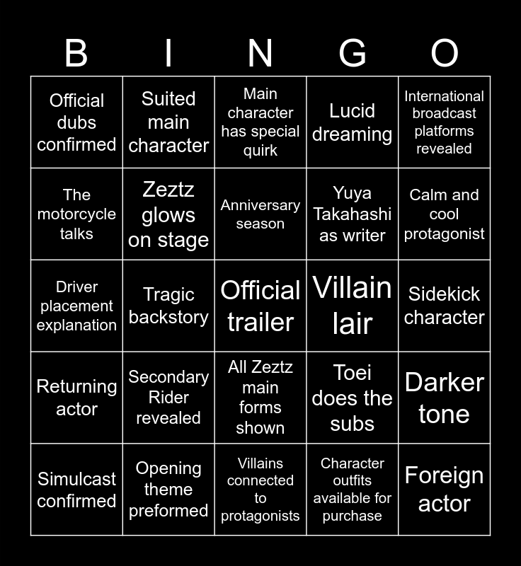 This bingo card has a free space and 24 words: Secondary Rider revealed, Opening theme preformed, Anniversary season, Simulcast confirmed, International broadcast platforms revealed, Official dubs confirmed, The motorcycle talks, Suited main character, Villain lair, All Zeztz main forms shown, Yuya Takahashi as writer, Driver placement explanation, Toei does the subs, Darker tone, Zeztz glows on stage, Character outfits available for purchase, Sidekick character, Main character has special quirk, Calm and cool protagonist, Tragic backstory, Foreign actor, Returning actor, Lucid dreaming and Villains connected to protagonists.