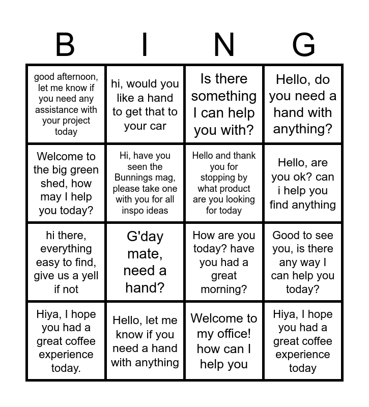 This bingo card has 20 words: Good to see you, is there any way I can help you today?, Hey, after something specific or are you just having a look?, Is there something I can help you with?, Wow, that project sounds awesome, is there anything else you need?, Hiya, I hope you had a great coffee experience today., Welcome to the big green shed, how may I help you today?, Hello, let me know if you need a hand with anything, good afternoon, let me know if you need any assistance with your project today, hi there, everything easy to find, give us a yell if not, hi, would you like a hand to get that to your car, G'day mate, need a hand?, How are you today? have you had a great morning?, Hi, have you seen the Bunnings mag, please take one with you for all inspo ideas, Hiya, I hope you had a great coffee experience today, Hello and thank you for stopping by what product are you looking for today, welcome, are you after anything in particular, Hello, are you ok? can i help you find anything, Hello, do you need a hand with anything?, Welcome to my office! how can I help you and Hello, Bunnings Ellenbrook _____ speaking, how can I help you today?.