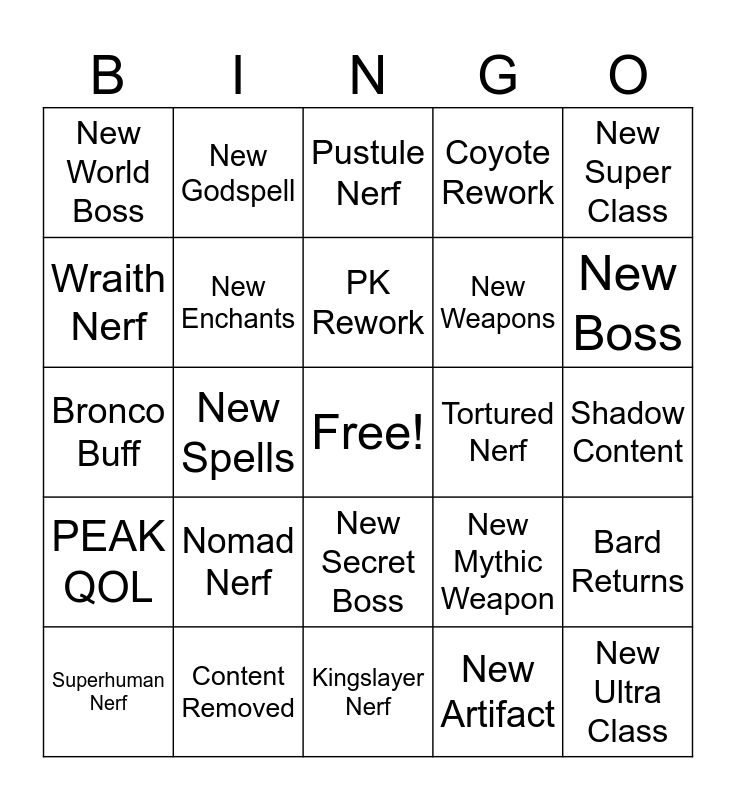 This bingo card has a free space and 24 words: Nomad Nerf, Content Removed, PK Rework, Superhuman Nerf, New Super Class, New World Boss, Wraith Nerf, New Godspell, Tortured Nerf, New Secret Boss, New Weapons, Bronco Buff, New Mythic Weapon, Bard Returns, New Enchants, New Artifact, Shadow Content, Pustule Nerf, New Boss, New Spells, New Ultra Class, PEAK QOL, Coyote Rework and Kingslayer Nerf.
