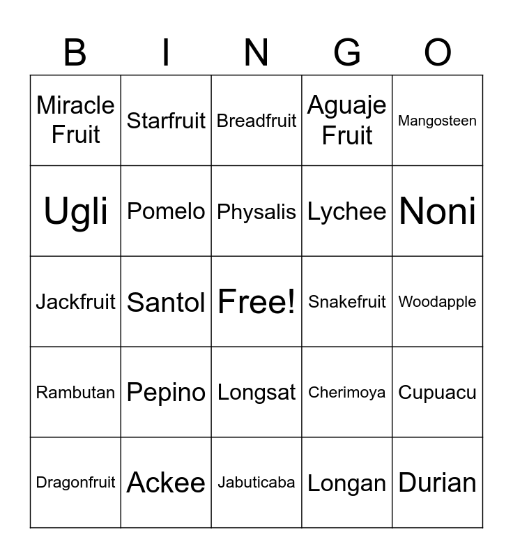 This bingo card has a free space and 24 words: Pepino, Ackee, Physalis, Dragonfruit, Mangosteen, Miracle Fruit, Ugli, Starfruit, Snakefruit, Longsat, Lychee, Jackfruit, Cherimoya, Cupuacu, Pomelo, Longan, Woodapple, Breadfruit, Noni, Santol, Durian, Rambutan, Aguaje Fruit and Jabuticaba.
