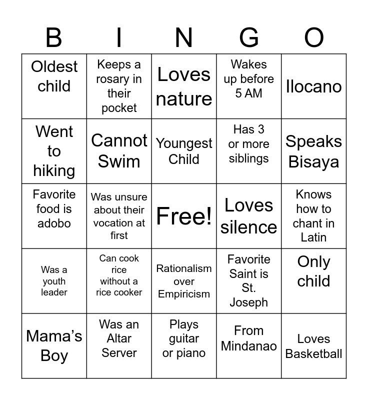 This bingo card has a free space and 24 words: Can cook rice without a rice cooker, Was an Altar Server, Youngest Child, Mama’s Boy, Ilocano, Oldest child, Went to hiking, Keeps a rosary in their pocket, Loves silence, Rationalism over Empiricism, Has 3 or more siblings, Favorite food is adobo, Favorite Saint is St. Joseph, Only child, Cannot Swim, From Mindanao, Knows how to chant in Latin, Loves nature, Speaks Bisaya, Was unsure about their vocation at first, Loves Basketball, Was a youth leader, Wakes up before 5 AM and Plays guitar or piano.
