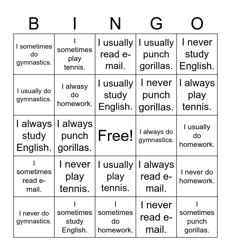 This bingo card has a free space and 24 words: I never play tennis., I sometimes study English., I usually study English., I never do gymnastics., I never study English., I sometimes do gymnastics., I usually do gymnastics., I sometimes play tennis., I always do gymnastics., I usually play tennis., I never punch gorillas., I always study English., I always read e-mail., I never do homework., I alwasy do homework., I never read e-mail., I usually do homework., I usually read e-mail., I always play tennis., I always punch gorillas., I sometimes punch gorillas., I sometimes read e-mail., I usually punch gorillas. and I sometimes do homework..