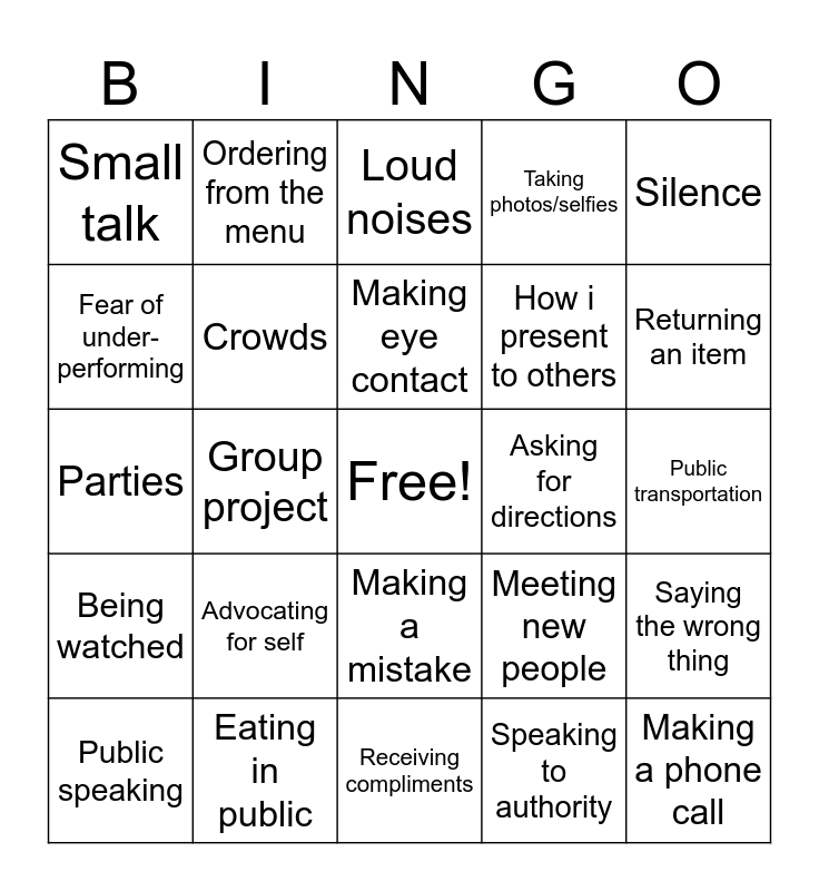 This bingo card has a free space and 24 words: Advocating for self, Eating in public, Making eye contact, Public speaking, Silence, Small talk, Fear of under-performing, Ordering from the menu, Asking for directions, Making a mistake, How i present to others, Parties, Meeting new people, Saying the wrong thing, Crowds, Speaking to authority, Public transportation, Loud noises, Returning an item, Group project, Making a phone call, Being watched, Taking photos/selfies and Receiving compliments.
