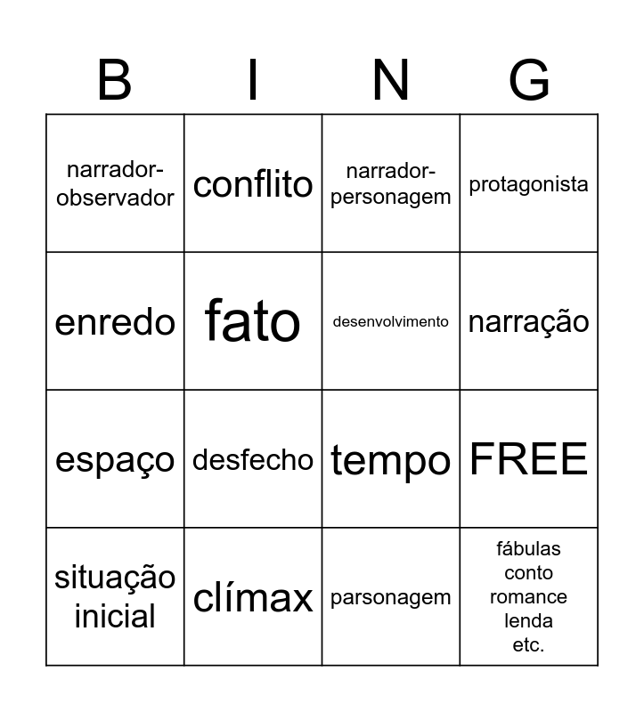 This bingo card has 16 words: clímax, FREE, narrador-personagem, narrador-observador, espaço, conflito, tempo, parsonagem, enredo, fato, situação inicial, protagonista, desfecho, narração, desenvolvimento and fábulas conto romance lenda etc..