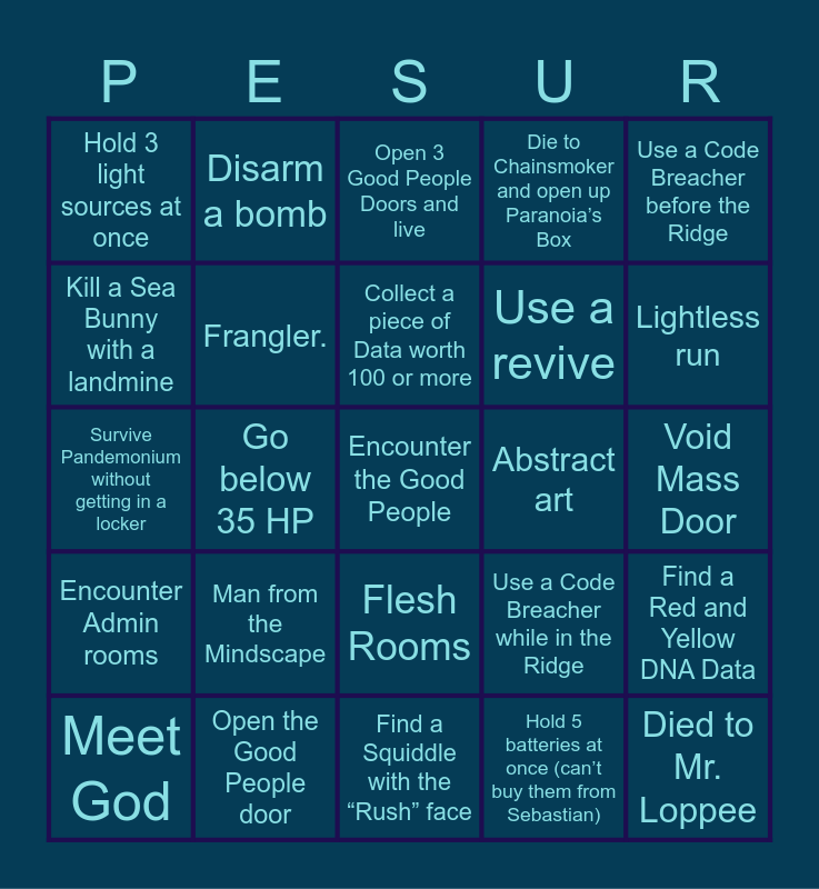 This bingo card has a free space and 100 words: Oxygen Gardens, Wall Dweller, Void Mass Door, Toy Remote (can’t buy at start), Make Sebastian Mad, Multi-Monster (A-60), Rare Room, 3 or more Squiddles in one room, Encounter 3 or more Angler variants (Normal doesn’t count), Buy something that costs 200 data or more, Turrets, Sebastian bullies you, Unusual colored Void Mass, Open the Good People door, Gauntlet, Die to Angler, Use a revive, Final encounter, Pandemonium, The Ridge, Rare Item, Open a room that can only be opened with Code Breachers, Abstract room, Hide in a safe spot 3 or more times, Get more than 1 speaker in The Ridge, Abstract art, Use a Code Breacher before the Ridge, Use a Code Breacher while in the Ridge, Find 2 items in 1 room, Pipes Puzzle, Go below 35 HP, Hold 3 light sources at once, Get Eyefestation in a side room, Encounter Eyefestation, Hold 5 batteries at once (can’t buy them from Sebastian), Collect a piece of Data worth 100 or more, Find a Red and Yellow DNA Data, Find a Dark Blue DNA Data, Survive a Grand Encounter (Firewall/Abomination), Locker -less run, Eat Wall Dweller Flesh, Activate Imaginary Friend, Survive Pandemonium without getting in a locker, Enrage Eyefestation 3 times, Lightless run, Open 3 Good People Doors and live, Encounter Trench Bleeder, Die to Void in the Ridge, Die to Sebastian, Find a Squiddle with the “Rush” face, Collect at least 3000 Data, Get a Gummy or Sporg light (buying in drop dead shop doesn’t count), Styx., Die before opening the first door, Activate 2 Squiddles at once, Encounter Mr. Loppee, Get Imaginary Friend from a drawer/desk/shelf, Die to PDG, Find P.AI.nter in Heavy Containment, Die to Chainsmoker and open up Paranoia’s Box, Beat the Game, Encounter Burning Oxygen Gardens, Drink a Party Special, Encounter one of every Angler type, Encounter Pandemonium in the Ridge, Encounter Deep Sea Bunnies (can’t be the one you spawn with), Frogger., Rare Voiceline, Pinkie., Blitz., Chainsmoker., Man from the Mindscape, Candlebrute (the big one), Encounter Rotten Coral, Make 3 Fish Puns without your comrades realizing that you’re completing this task, Get Both imaginary Friends, Heavy Containment, Kill a Sea Bunny with a landmine, Get Shot without dying, Sebastian and P.AI.nter dialogue, Stairwell 87, Died to Mr. Loppee, Rescue P.AI.nter, Flesh Rooms, Survived Pandemonium minigame, Disarm a bomb, Die by falling in a pit, Die by running out of Oxygen in Fire room, Encounter Bottomfeeder, Encounter Admin rooms, Get “I heard your Voice again” when you first walk into Sebastian’s Shop, Fail to notice a doorstopper, Gambling Room, Meet God, Frangler., Use a medkit and die within 5 rooms, Perithesene (Abomination doesn't count), Collect multiple high-value research items (50$+) in one room, Softlock Sea Bunny and Receive rare trade item.