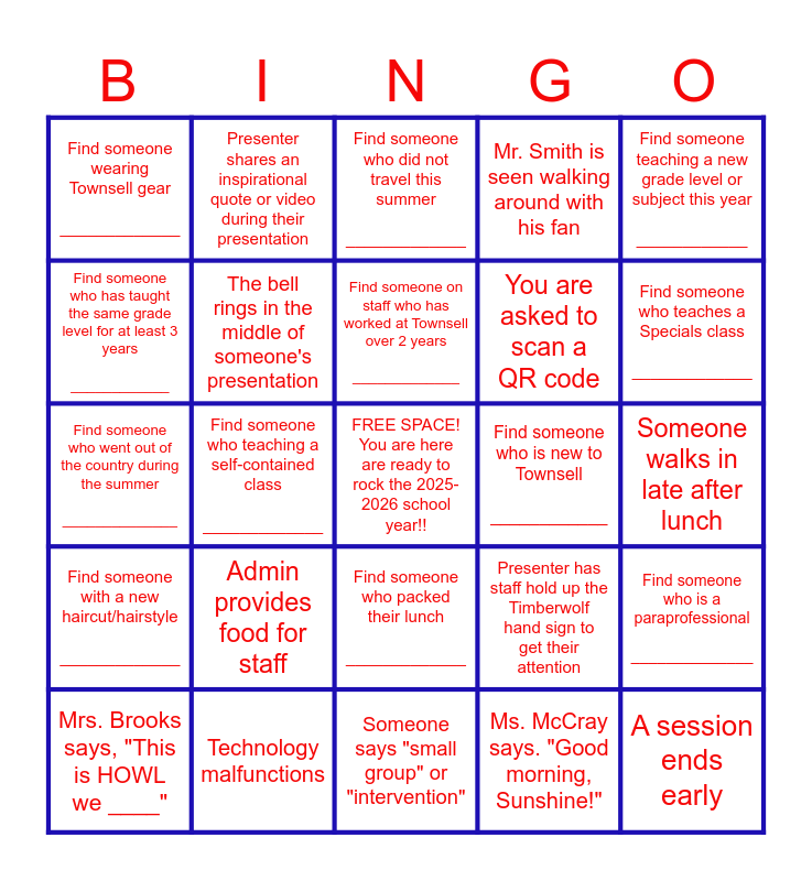 This bingo card has a free space and 34 words: Someone says "The gift of time", Ms. McCray says. "Good morning, Sunshine!", Ms. Maxson plays "Clap it Up" with staff, Find someone who has on the same color as you _____________, Find someone with a new haircut/hairstyle _____________, The bell rings in the middle of someone's presentation, Find someone teaching a new grade level or subject this year ____________, Mrs. Brooks says, "This is HOWL we ____", Presenter shares an inspirational quote or video during their presentation, Find someone who has been in education for over 5 years ____________, Find someone on staff who has worked at Townsell over 2 years _____________, Find someone who did not travel this summer _____________, Find someone who was born in the same month as you! ____________, Someone's phone goes off in the middle of PD, Find someone who is new to Townsell ____________, Find someone who teaches a Specials class _____________, Technology malfunctions, Find someone who went out of the country during the summer ______________, Admin provides food for staff, Presenter has staff hold up the Timberwolf hand sign to get their attention, Find someone who packed their lunch _____________, Find someone who must have their morning coffee in order to function _____________, Find someone wearing Townsell gear _____________, Someone walks in late after lunch, Someone says "small group" or "intervention", A session ends early, Mr. Smith is seen walking around with his fan, Find someone who's classroom looks like it should be a Pinterest inspo post ________________, You are asked to scan a QR code, Find someone who has taught the same grade level for at least 3 years ____________, Find someone who teaches math, science, AND social studies _____________, Find someone who teaching a self-contained class _____________, Find someone who is a paraprofessional ______________ and Ms. McCray has to remind Mrs. Brooks to stay on schedule.