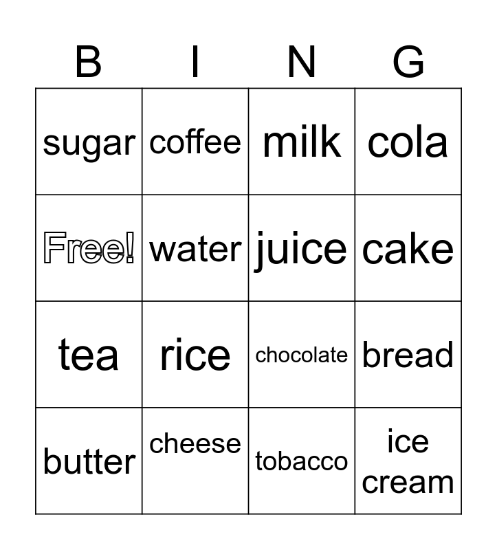 This bingo card has 16 words: cheese, bread, milk, sugar, tea, coffee, chocolate, tobacco, Free!, water, butter, cola, rice, cake, juice and ice cream.