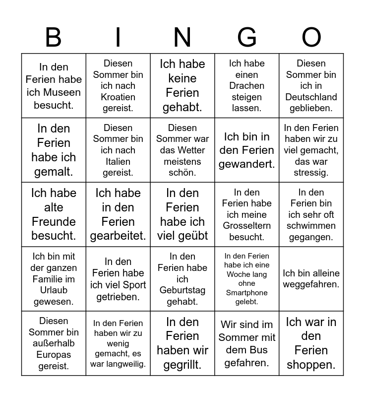This bingo card has a free space and 34 words: Jedes Jahr fahren wir zum selben Ort., Wir sind im Sommer mit dem Bus gefahren., Wir sind im Sommer mit dem Auto gefahren., Wir sind in ein anderes Land geflogen., Ich bin mit der ganzen Familie im Urlaub gewesen., Diesen Sommer bin ich nach Italien gereist., Diesen Sommer bin ich in Deutschland geblieben., Diesen Sommer bin außerhalb Europas gereist., Diesen Sommer bin ich nach Kroatien gereist., Ich habe jede Woche Eis gegessen., Diesen Sommer war das Wetter meistens schön., Ich habe keine Ferien gehabt., In den Ferien habe ich nicht so viel gelesen., In den Ferien habe ich mega viel gelesen., In den Ferien habe ich meine Grosseltern besucht., In den Ferien haben wir zu viel gemacht, das war stressig., In den Ferien haben wir zu wenig gemacht, es war langweilig., Ich habe alte Freunde besucht., In den Ferien habe ich viel Sport getrieben., In den Ferien habe ich eine Woche lang ohne Smartphone gelebt., In den Ferien habe ich Geburtstag gehabt., In den Ferien habe ich keine neuen Kleider gekauft., In den Ferien habe ich Museen besucht., In den Ferien bin ich sehr oft schwimmen gegangen., In den Ferien haben wir gegrillt., Ich war in den Ferien shoppen., Ich habe einen Drachen steigen lassen., Ich war in den Ferien am Strand., Ich bin in den Ferien gewandert., In den Ferien habe ich gemalt., Mir war es in den Ferien zu kalt., Ich habe in den Ferien gearbeitet., Ich bin alleine weggefahren. and Ich bin zu Hause geblieben..